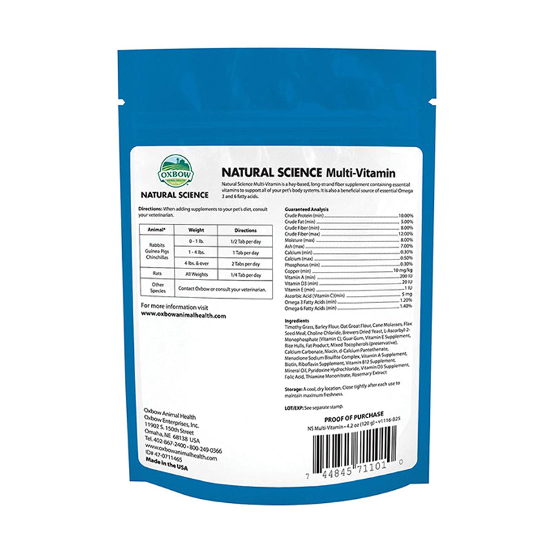 Natural Science Multi-Vitamin is a hay-based, high-fiber supplement containing essential vitamins to support all of your pet's body systems. It is also a beneficial source of essential Omega 3 and 6 fatty acids.