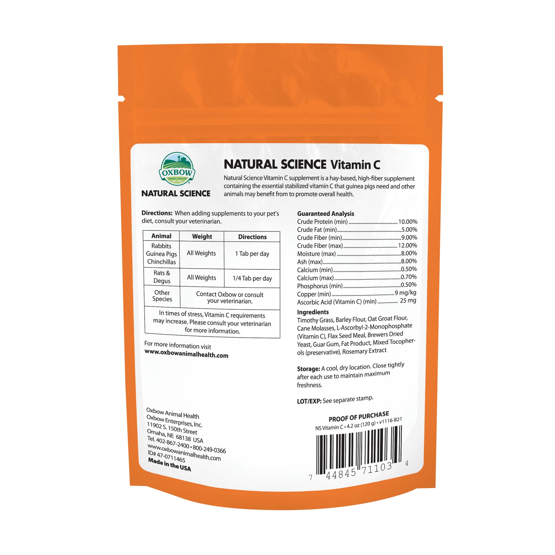 Stabilized Vitamin C for your best friend! Natural Science Vitamin C contains high fiber Timothy hay and the stabilized vitamin C that guinea pigs needs and other animals benefit from during times of stress, illness or recovery. Offer Natural Science supplements to support the wellness of your small pets.